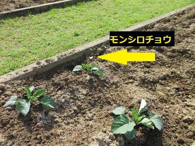 ③まだ植えたばかりで葉も少ないキャベツに、1匹のモンシロチョウが卵をうみつけていました。ときどきキャベツの葉の裏側にとまって、うみつけていました。暖かくなってきたので、学校のまわりにはいろいろな生き物が見られるようになってきました。
