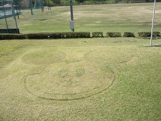 ④校務員さんが、運動場へ向かうところの芝にミッキーマウスを描いてくれました。特に2階から見るとはっきりとわかります。みなさん、ぜひ見てください。