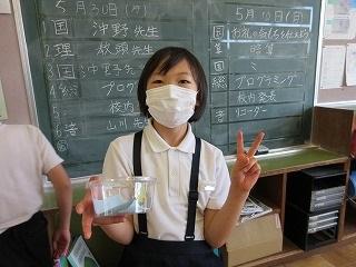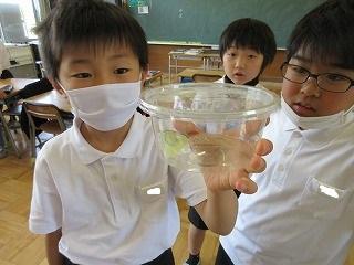 5年生は4限目に、「魚のだんじょう」の学習で、オス・メスの見分け方やメダカの飼い方を学習していました。