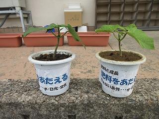 肥料をあたえた方はの数が8枚。 肥料をあたえない方は葉の数が5枚。 肥料をあたえた方の葉が大きい。 |