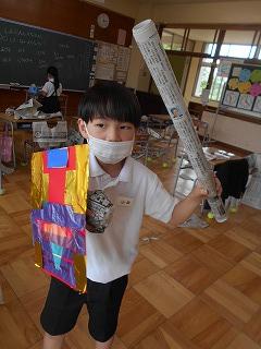 たこ焼き屋さん、お家、魔女のほうき、洋服、腕輪・指輪、剣、アイス、傘、靴、携帯電話など、新聞紙から、発想豊かにいろいろなものを作って楽しんでいました。