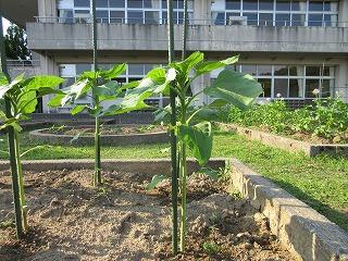 3年生は5限目の理科の時間に、ヒマワリ・オクラ・ピーマン・ホウセンカがどれくらい成長しているか調べました。