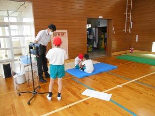 今日は朝学習の時間に5・6年生が反復横跳びとソフトボール投げの練習をしていました。
