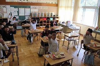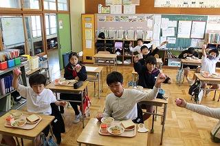 給食の時間には、5・6年生が育てたもち米を使った大福をほおばり、おなかいっぱい!