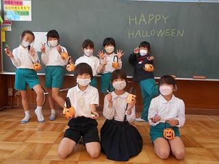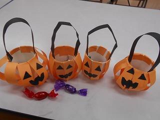 1・2年生は、先日、英語でハロウィンをしました。カボチャのランタンを作り、「トリック オア トリート!」で、どんぐりのキャンディー(食べられません)をもらって入れました。