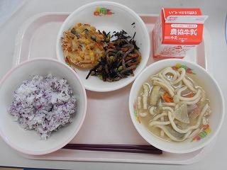 今日の給食は、ゆかりごはん、かきあげ、ひじきの炒め煮、打ち込み汁です。