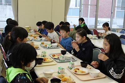 給食準備の様子を見ていただいた後、1年教室で一緒に給食を食べました。