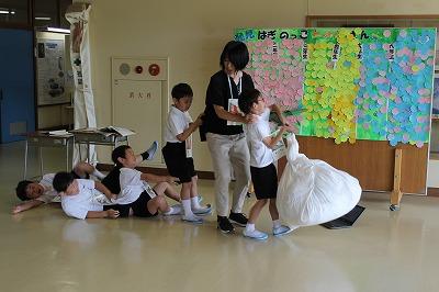 なかなか抜けない大きなかぶ。みんなで力を合わせて抜く様子をとても上手に演じてくれました。