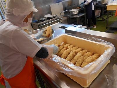 給食室では、朝から調理員さんが一生懸命揚げパンを作ってくれていました。