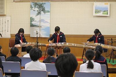 5・6年生の女子は琴を体験し、3限の演奏会の最初に「さくら」を演奏しました。