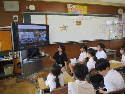 今日の6限目に、3・4年生は外国語活動の学習で、笠野小の3.4年生とオンラインで交流をしました。