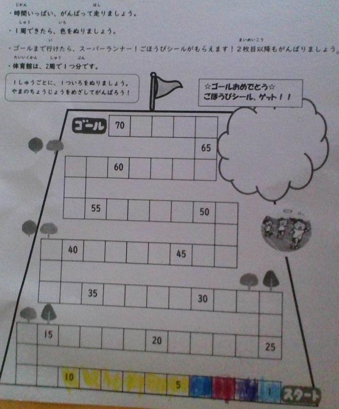 走り終わった後、「走ろう運動カード」に走った分だけカードのマスに色を塗りました。子供たちは、何周まで走るのか、一人ひとり目標をたてて頑張っています。