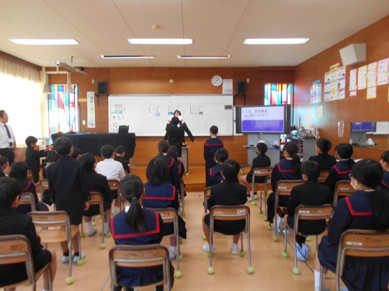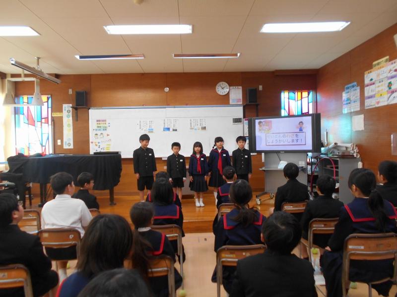 生活目標のふりかえりは2年生でした。2年生は10月の生活目標「身の周りの整とんをしよう」をふり返り、体操服やロッカー、お道具箱をきれいに整とんするコツを教えてくれました。これからも続けていきたいですね。