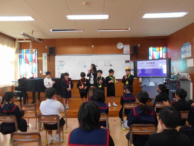 今日は、月初めの全校集会もありました。今月は、夏休みの読書感想文、マラソン大会、自学王の取り組みに関する表彰がありました。一生けん命に何かに取り組むって素敵ですね。全校で大きな拍手を送り合いました。