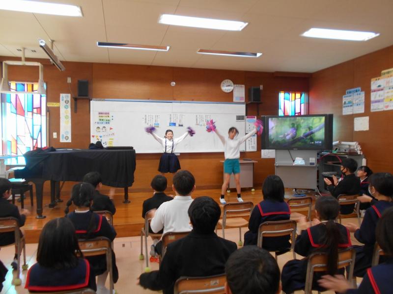1年生は特技のフラフープを披露してくれました。1年生なのに、堂々と前に出て演技をしてすごい!大きな拍手が送られました。4・5年生のペアは習い事のチアダンスを披露してくれました。10月の今月の歌でもある「ハピネス」に合わせて堂々のダンス。大きく手を広げてステップもすてきでした。最後に6年生は、総合の学習で調べた中国の食べ物について発表してくれました。スライドを使って楽しく発表してくれました。