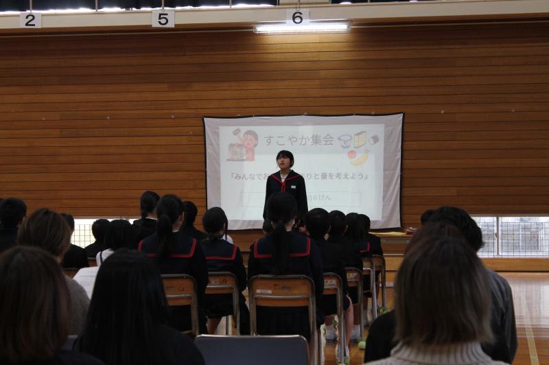 すこやか集会は、運営委員会の児童が司会を行い、健康委員長によるあいさつから始まりました。