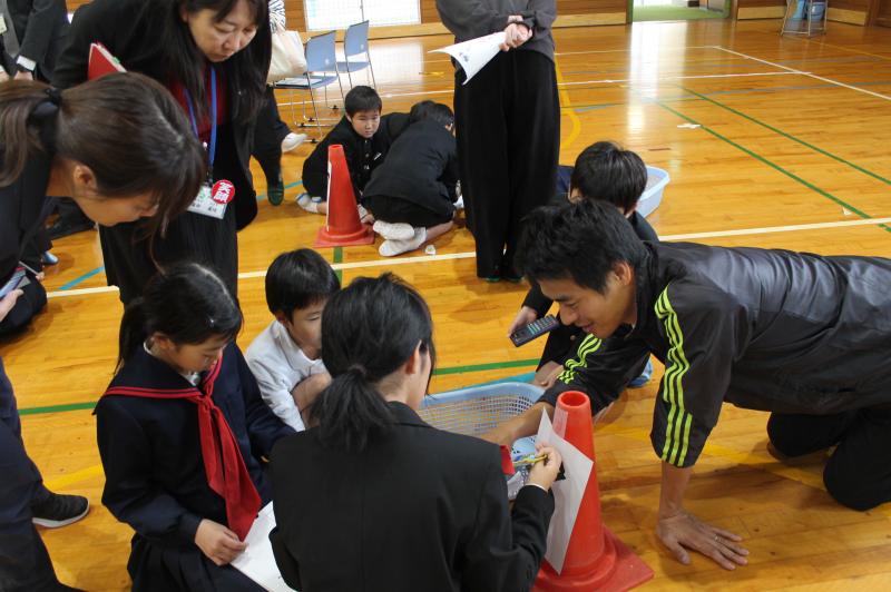 児童は、6年生の説明を聞いた後、スタンプカードを手に3つの遊びに分かれて楽しんでいました。