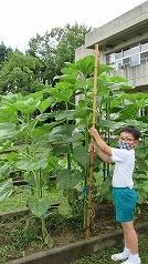 3年生が学習しているヒマワリとても大きく成長しています。3年生に1mものさしを持ってもらっていますが、身長よりはるかに高く、1mものさし2本分と同じくらいの高さ(約1m90cm)になりました。