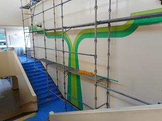 夏季休業中に、中央階段天井のガラスブロックを修理しています。足場を組んで、工事をしています。来週の新学期には完了する予定です。