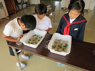 一人一人が育てているカイコ。約半数の児童のカイコが脱皮しました。今回が最後の脱皮だそうです。みんな、カイコの成長を見るのを楽しみにしています。