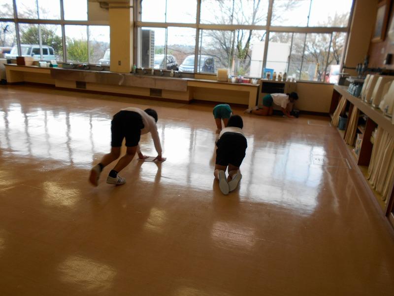 からっぽになった教室を全員で水拭きした後、1~3年生は帰宅し、4~6年生はワックスのかけかたの説明を聞き、黙々と作業に取り組んでいました。