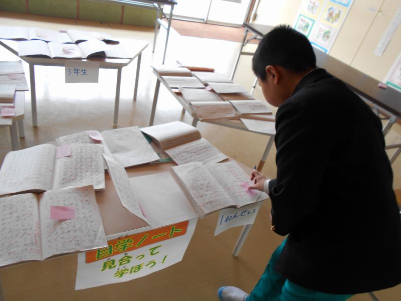 展示室には自学ノートが学年ごとに並べられていました。どのノートも力作ばかりでした。さっそく1,6年生たちがコメントを書いていました。すてきな学び合いの場になっていました。