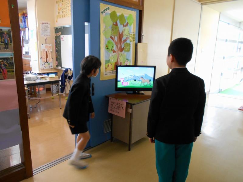 体育館に向かう通路前では、集会で発表したお話をモニターで紹介していました。