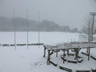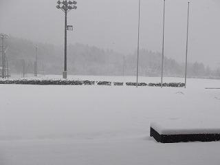 先日の大雪で積もった雪がグラウンドにはまだまだ残っており、遮るもののない雪原に