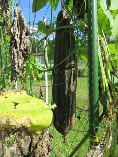 4月に植えたヘチマの小さな種は、みるみる大きくなり、花が咲き、実がなりました。その実が、緑色から黄土色に変わっているものも見受けられます。