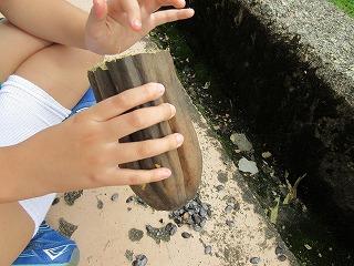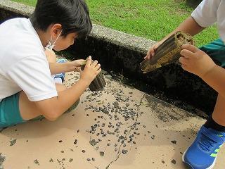 5限目の理科の時間に、4年生は、ヘチマの実の中の様子を調べました。3年生のとき、「植物は、花が咲き、実ができた後、たねができる」という学習をしました。ヘチマも、本当にたねができているのか、たねができていたら数はどれくらいかを考えながら調べました。