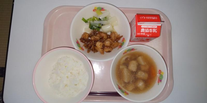 今日の給食は山口県の献立でした。チキンチキンごぼうはごぼうと鶏肉を揚げて甘辛く絡めたものでご飯がよく進む料理でした。大根とねぎのぬたは、児童には少し苦手な献立だったみたいですが、みんな頑張って食べていました。大平は本来煮物ですが、少し汁を多めにして食べやすくしてみました。苦手なものもあったようですが、しっかり食べていましたよ♪