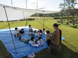 夏のときほど気温は高くないのですが、日差しは強いです。ぽかぽか陽気の中、テントの中は日差しが弱まり、とても快適で、気持ちよく読み聞かせを聞くことができていました。