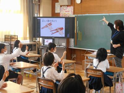 初めに、正しいお箸の持ち方や食事中にしてはいけないお箸の使い方(まよいばし、さしばし、わたしばし等)のお話を聞きました。