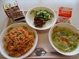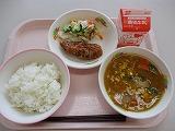 牛乳、黒糖パン、チーズオムレツ、ヤーコンのソテーとポークビーンズでした。ヤーコンはいつもはきんぴらなど和風にするのですが、今回はコンソメ味のソテーにしました。ベーコン、にんじん、コーンを入れたソテーは少し入れたしょうゆの香ばしさでとてもおいしかったです♪独特の甘さがある黒糖パンもみんなに好評でしたよ!!