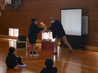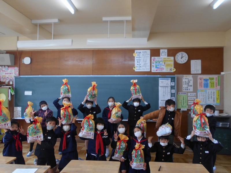 終業式の前に、公民館長さんからプレゼントをいただきました。教室に帰って、記念撮影をしました。大喜びでした。ありがとうございました!