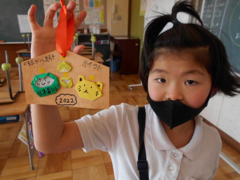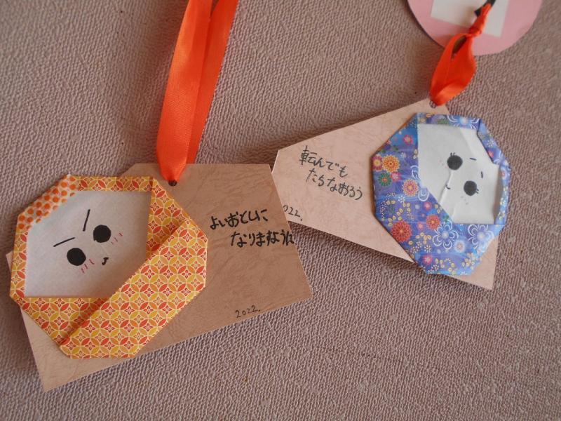 その後、お正月の絵馬のかざりを作りました。だるまやトラを折り紙で折って、貼りました。とてもかわいい作品になりました。「2022年」「よい年になりますように」「七転び八起き」、とらにちなんで「トライ!」などと書いている子もいました。