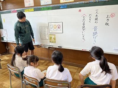 今日の朝学習の時間に、1・2年生教室でPTAの家庭教育委員さんによる読み聞かせがありました。