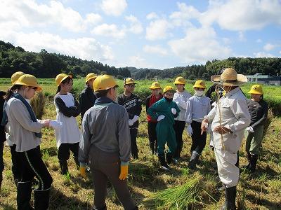 今日も、前日までにいろいろと準備をしてくださり、すぐに刈り取り作業ができるようになった田んぼで、いざスタートです。