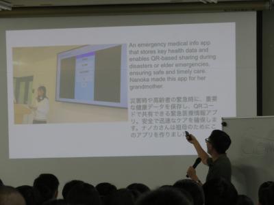 サミット開催中には、自ら考案・開発したアプリについて英語でプレゼンを行い、マサチューセッツ工科大学電気電子工学科のハル教授や、MIT App Inventorの開発担当者に大変興味深く聞いていただいたとのことです。