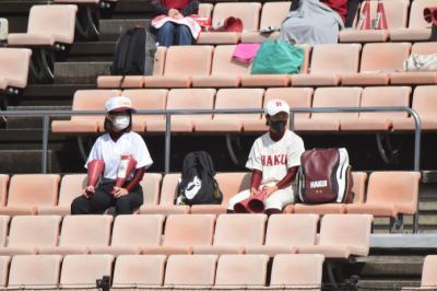 3回戦の星稜戦は、初回に3点を先制したものの直後に逆転を許し、追い上げ及ばず4-5で敗れました。シード校の星稜とは、春の県大会3回戦でも対戦しており、その時は0-8の7回コールドという結果でしたので、なんとしてもリベンジをと意気込みましたが、力及びませんでした。残念な結果でしたが、選手はたいへんよく頑張ってくれたと思います。特に3年生(部員10名マネージャー2名)を中心に、大会に入ってからのチームのまとまりと成長ぶりには目を見張るものがありました。練習時間も限られる中、集中して練習してきたことを出し切ったと思います。またスタンドでは、声を出しての応援ができない中で、選手の家族、学校関係者、羽高生、歴代OBやその家族、地域の方々など、多くの方の応援をいただきました。叩いて音を出すのに用意したメガホンが足りなくなるほどの大応援団で、選手にとってもたいへん心強かったと思います。応援してくださった皆さん、本当にありがとうございました。