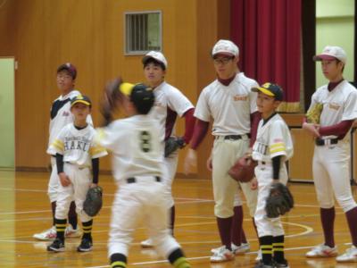 12月12日(日)羽咋市立西北台小学校体育館において、学童野球羽咋クラブを対象に野球教室を実施しました。今回は鹿西高校野球部と合同で行いましたが、お互い協力し合いながら進めることができました。学童の選手20人に対し、両校で高校生部員22人、マネージャー6人が参加、体育館ではあちこちで指導する姿や質問する場面が見られ、終始熱気に包まれていました。同学童クラブ出身高校選手が4人おり、その成長ぶりにクラブの指導者の方々も喜んでおいでました。体ほぐしのウォーミングアップに始まり、テニスボールを使った守備練習・バッティング練習など、短時間ではありましたが中身の濃い練習ができました。高校生のピッチングやノックを披露したあと、質疑応答となり羽咋クラブの選手からたくさんの質問を受けて終了となりました。最後は全員で記念写真を撮影し、来シーズンの健闘を誓って閉会しました。同時に行われた「救命救急講習会」には、学童野球の保護者に交じってマネージャーも参加し、羽咋消防署の方から応急手当の仕方や心肺蘇生法などをしっかり学びました。羽咋クラブ、鹿西高校野球部の選手・指導者のみなさん、そして関係者・保護者の方々、ほんとうにありがとうございました。