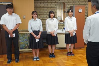 6月16日(月)、校長室にて北信越大会に出場する4名の選手に向け激励金贈呈式が行われ、中川校長から「学校全体で応援していますので、力を出し切って楽しんできてください。」と激励金とともにエールの言葉が贈られました。