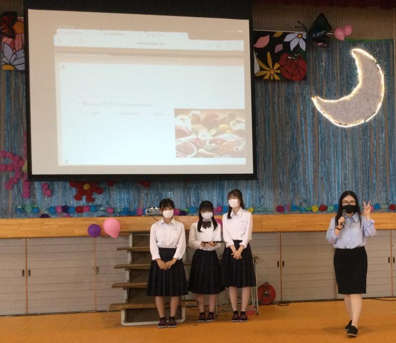 9月2日(金)文化祭1日目のステージ発表で、英語部は8月から新しく赴任されたALTのリサさんを紹介しました。リサさんご本人も登場し、アメリカ・カリフォルニア州のことやご家族のこと、趣味などについてクイズも出しながら生徒は英語で説明しました。