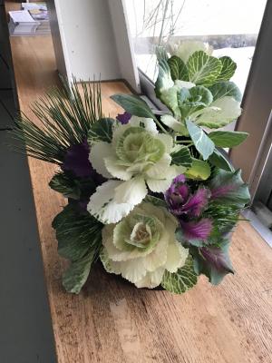 そこで、花を切り直してアレンジしました。花材はハボタンと松です。