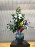 花材は上から柳、ユリ、カーネーション、シャクヤク、デルフィニウム(青)、カスミソウ、