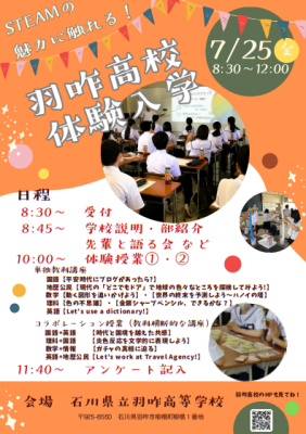 ▶ 令和7年度石川県立羽咋高等学校体験入学について