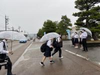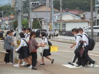 羽咋駅で、生徒会執行部とPTA会長さん 校門前の生徒会執行部 校門前(手前)、念法寺前(奥)の横断歩道を渡る生徒
