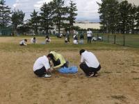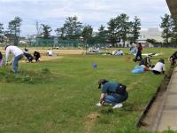 むしる人、集める人、手分けしてきれいに 野球場の中もみんなで除草 積みあがったゴミ袋