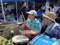 はくい吹奏楽団の皆様との合同演奏で、ワシントンポスト(J.P.スーザ作曲)、愛の花(朝ドラ「らんまん」テーマ曲)、銀河鉄道999を披露しました。お客様が間近にいて少し緊張しましたが、屋外ステージの解放感が気持ちよく、楽しんで演奏することができました。