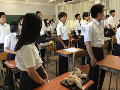 井上学校長は「学校内の活動にとどまらず、校外の活動にチャレンジしてほしい。チャレンジするきっかけはどこにでもあるが気付かないだけ。新学期の皆さんは前向きにやる気満ち溢れた姿で登校していることを願います。」と式辞を述べられました。